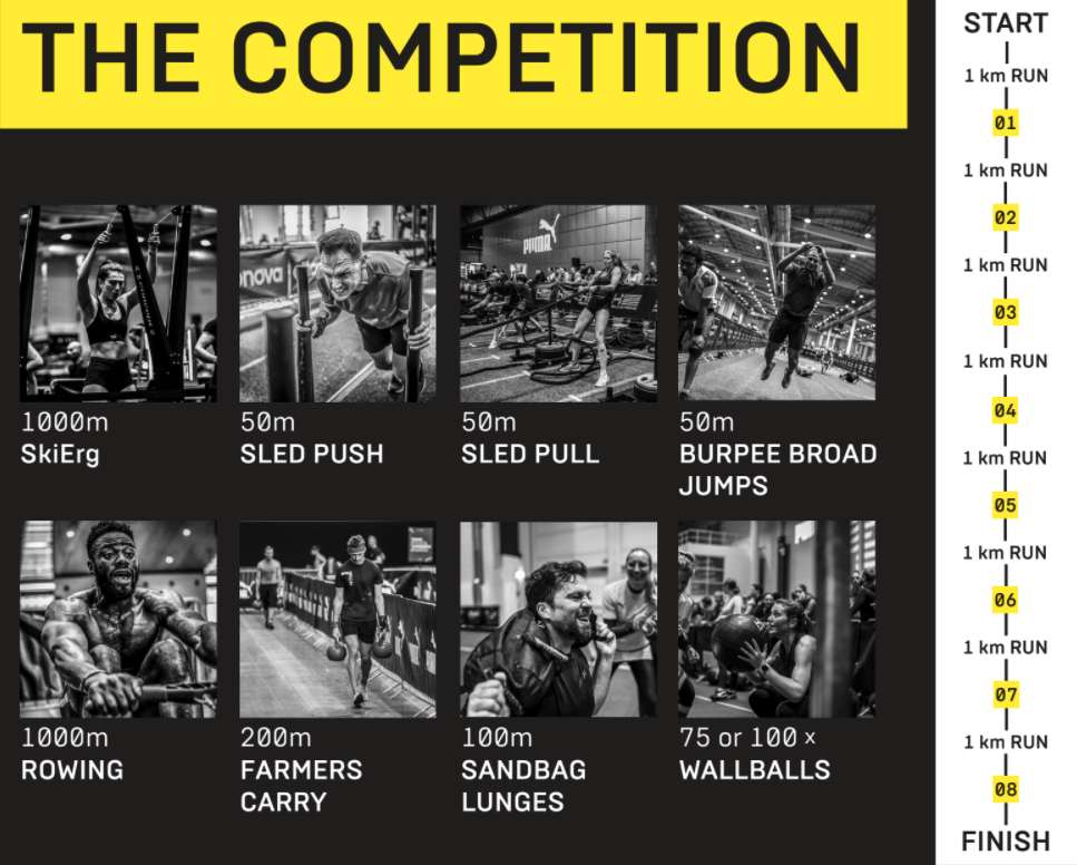 Das größte Indoor-Sportevent der Welt beinhaltet wiederholte 1km-Läufe jeweils vor und nach den 8 standardisierten Workouts, geeignet für professionelle Athleten, aber auch für den enthusiastischen Freizeitsportler, entweder als Team oder Individual. Die Workouts bestehen zum Beispiel aus Einheiten am SkiErg oder auf dem Rudergerät, aus Schlittenschieben und -ziehen, Farmers´ Carries und anderen Disziplinen. Die offiziellen HYROX-Races finden in ausgewählten Messehallen auf der ganzen Welt statt. Bei uns findest Du auf 400qm-Fläche alles für Dein HYROX Training.